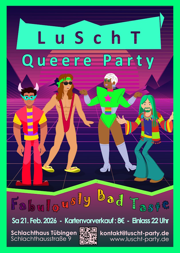 Einmal im Quartal findet die LuSchT im Schlachthaus in Tübingen statt. Unsere Mottoparties sorgen dabei für eine ganz eigene, besondere Stimmung und sind genauso vielfältig, wie ihre Besucher. Von und für Lesben, Schwule und Bisexuelle und rein ehrenamtlich, unterscheiden wir uns darüber hinaus von den meisten anderen Queerparties. Die Erlöse der Party werden für Projekte der Aidshilfe Tübingen - Reutlingen e.V. verwendet.