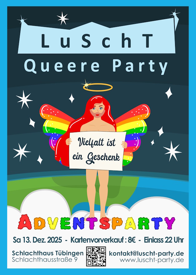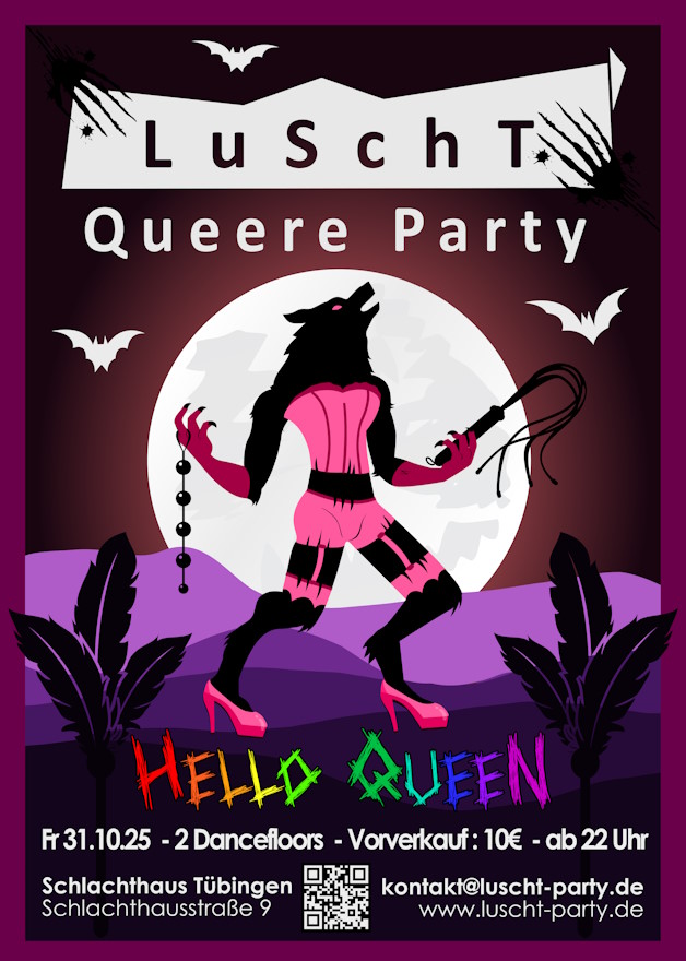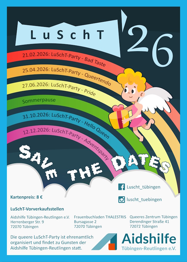Einmal im Quartal findet die LuSchT im Schlachthaus in Tübingen statt. Unsere Mottoparties sorgen dabei für eine ganz eigene, besondere Stimmung und sind genauso vielfältig, wie ihre Besucher. Von und für Lesben, Schwule und Bisexuelle und rein ehrenamtlich, unterscheiden wir uns darüber hinaus von den meisten anderen Queerparties. Die Erlöse der Party werden für Projekte der Aidshilfe Tübingen - Reutlingen e.V. verwendet.