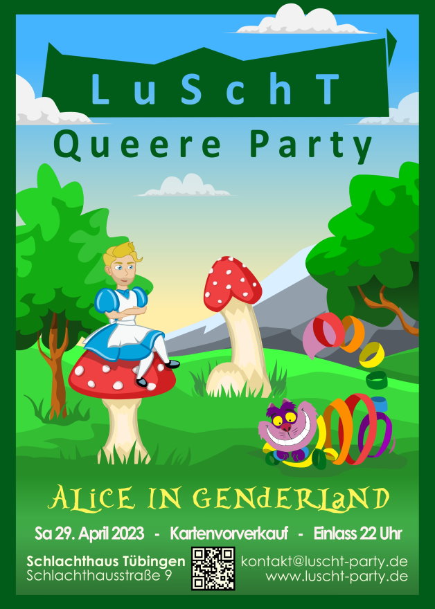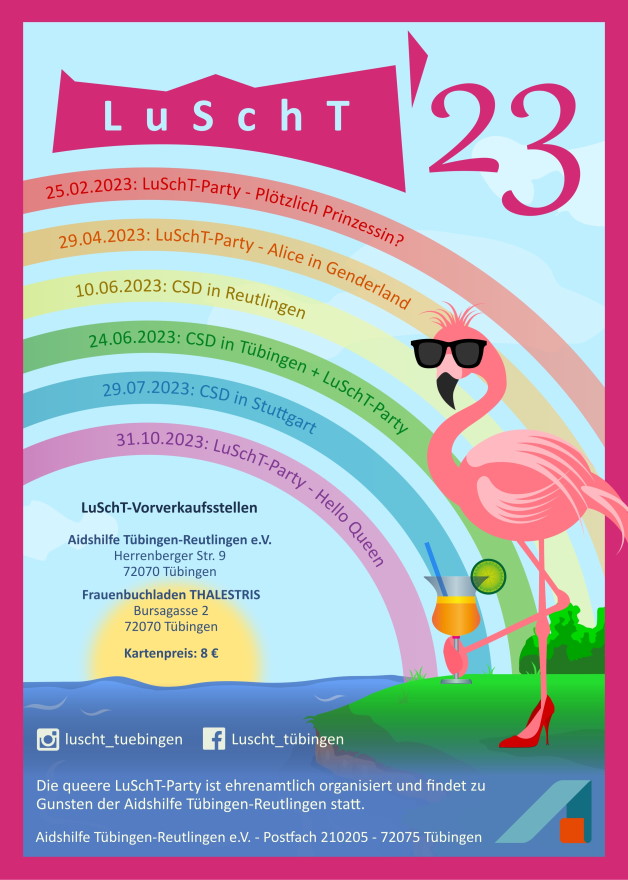 Einmal im Quartal findet die LuSchT im Schlachthaus in Tübingen statt. Unsere Mottoparties sorgen dabei für eine ganz eigene, besondere Stimmung und sind genauso vielfältig, wie ihre Besucher. Von und für Lesben, Schwule und Bisexuelle und rein ehrenamtlich, unterscheiden wir uns darüber hinaus von den meisten anderen Queerparties. Die Erlöse der Party werden für Projekte der Aidshilfe Tübingen - Reutlingen e.V. verwendet.