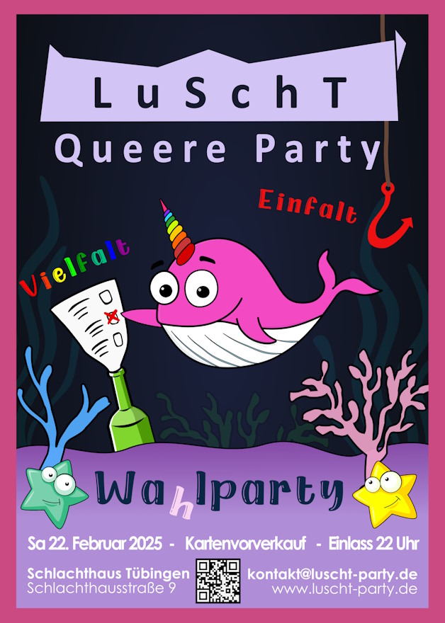 Einmal im Quartal findet die LuSchT im Schlachthaus in Tübingen statt. Unsere Mottoparties sorgen dabei für eine ganz eigene, besondere Stimmung und sind genauso vielfältig, wie ihre Besucher. Von und für Lesben, Schwule und Bisexuelle und rein ehrenamtlich, unterscheiden wir uns darüber hinaus von den meisten anderen Queerparties. Die Erlöse der Party werden für Projekte der Aidshilfe Tübingen - Reutlingen e.V. verwendet.